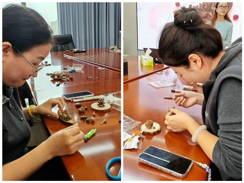活动开始,熏香制作老师给大家分发了多种多样的植物干果与果壳,接着,熏香制作老师为大家介绍了各种植物干果与果壳的作用及特点,并对熏香的制作方法及制作步骤进行了细致的解说。女教职工们纷纷投入到整个制作过程中,大家用灵巧的双手和别出心裁的想象力,创作出独一无二的作品。最后将喜欢的香薰精油滴在自己做好的干果组合上,一个个造型各异、芬芳馥郁的香薰作品便制作完成。