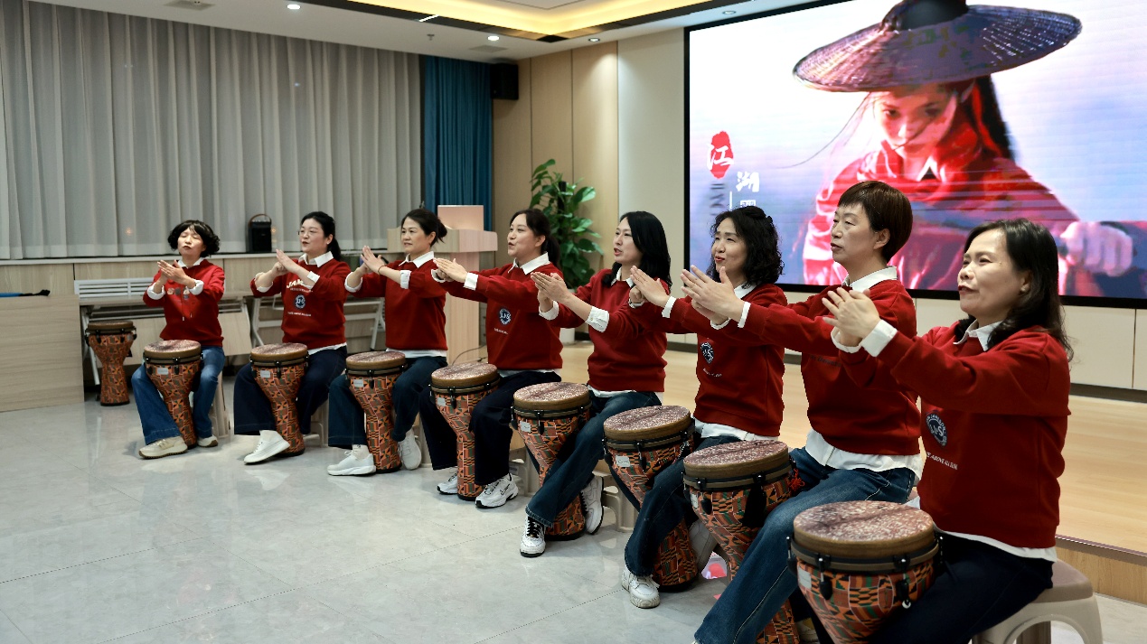 东南亚风情浓郁的非洲鼓《咖喱咖喱》,以明快灵动的节奏勾勒出异域画卷,鼓点轻扬间仿佛穿越热带雨林,让人心生向往;而非洲鼓与手势舞交织的《萱草花》,则以悠扬旋律与温柔手势,将对母亲的缱绻深情娓娓道来,静美之姿动人心弦,引得全场沉醉。新疆舞《我的美人》热情似火,裙摆飞扬如繁花绽放,舞步蹁跹间洋溢着西北大地的豪迈与奔放;非洲鼓《陕北说书》则别出心裁,将地方曲艺与鼓点艺术巧妙结合,诙谐幽默的演绎引得全场欢声笑语不断,尽显老师们的多才多艺。